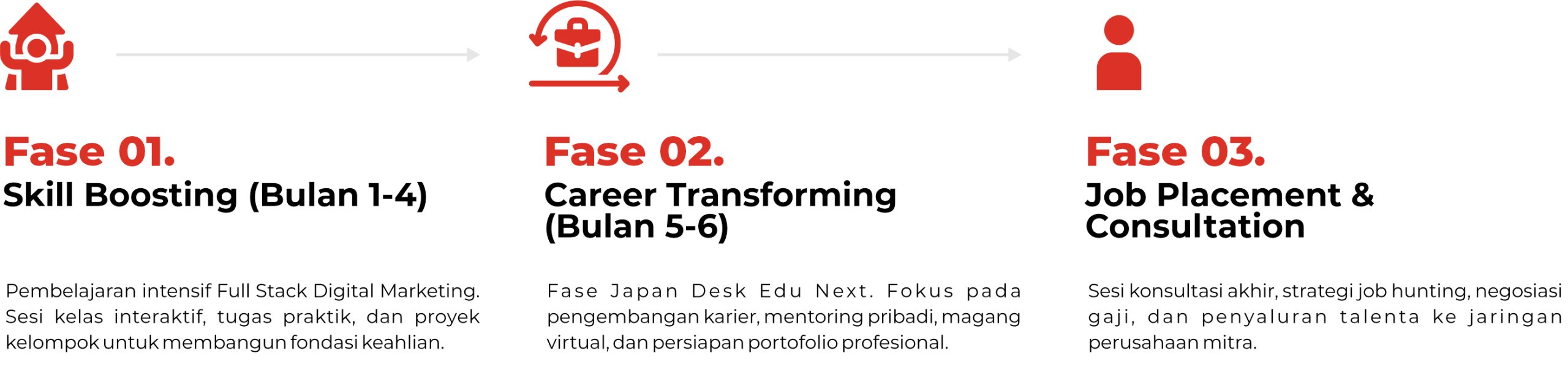Japan Desk Edu adalah program pendidikan komprehensif hasil kolaborasi ET Asia dan Hotaka Indonesia. Program ini dirancang khusus untuk mencetak talenta digital yang siap bersaing di pasar kerja Jepang. Tidak hanya mengajarkan hardskill Full Stack Digital Marketing, kami juga membekali Anda dengan pemahaman budaya kerja dan bahasa Jepang untuk memastikan Anda relevan di dunia digital global